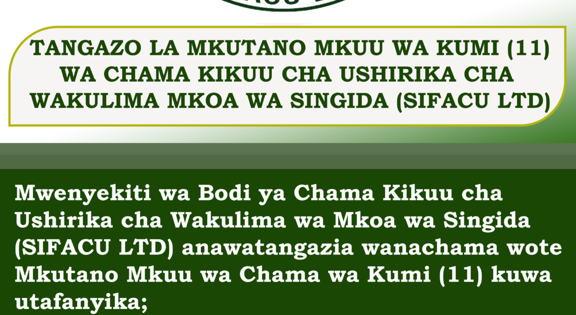 TANGAZO LA MKUTANO MKUU WA KUMI NA MOJA (11) Chama Kikuu cha Ushirika cha Wakulima wa Mkoa wa Singida (SIFACU LTD) Mwenyekiti wa Bodi ya Chama Kikuu cha Ushirika cha Wakulima wa Mkoa wa Singida (SIFACU LTD) anawatangazia wanachama wote kuwa Mkutano Mkuu wa Kumi na Moja (11) utafanyika kama